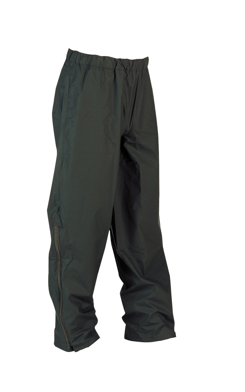 Pantalon de pluie avec élastique de serrage à la taille et soufflets au bas des jambes pour le passage des bottes ou chaussures forestières.